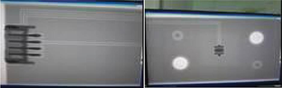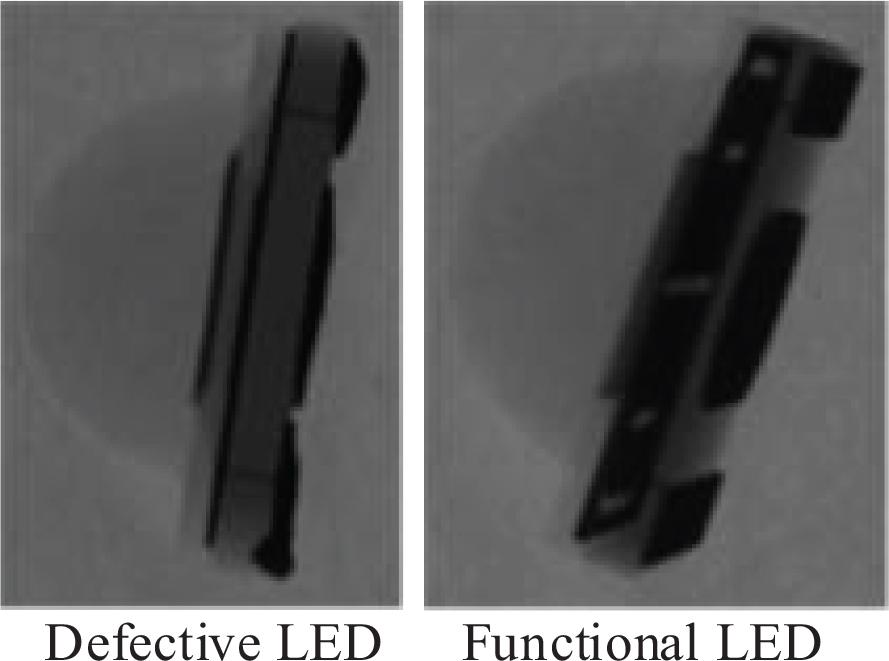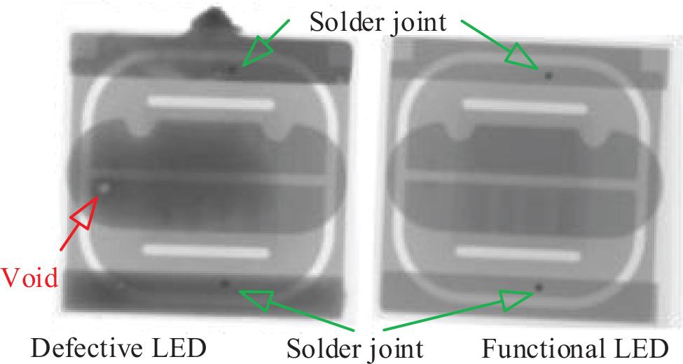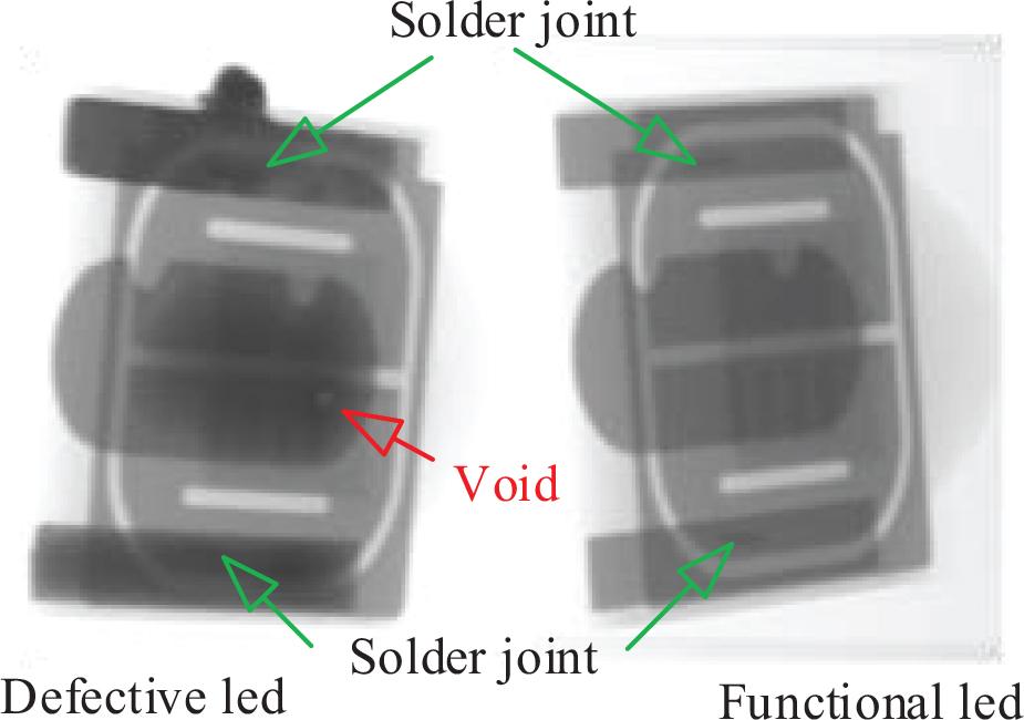 Moreover, this study identifies the primary causes of failures in LED boards, including individual LEDs, based on an analysis of defect reports received from user partners. The results revealed that damage occurred to the LED components after they were soldered onto an insulated metal substrate (IMS), which served as a heat sink. Figure. 1 illustrates a damaged LED module (coded 2583-164). X-ray images revealed no defects in the electrical circuit on the aluminum heat sink substrate (see Figure. 2). However, the defects were observed in the LED chips. Perpendicular and tilted X-ray images of the LED chip (Figures. 3 and 4) identified anomalies in the defective chips. In contrast, side-view images of the chips did not exhibit any distinguishable differences between the functional and defective LEDs, as shown in Figure. 5