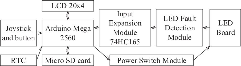 This section introduces the device’s core concept and the essential components for accurate fault diagnostics. A proposed design includes blocks shown in Figure. 7 to implement the requirements check for 200 boards with 3-LED. The control center is an Arduino Mega Kit. This board was selected due to the many digital I/O pins essential for huge LED boards (54 I/O pins). The second important module is the expansion board. One thousand two hundred input pins are necessary to determine the states of 600 LED units. It should be noted that a LED has three states: short, open, and regular circuit. It needs two pins to know the LED state. For the maximum checked LED on each board case, the calculation is conducted with 3-LED boards. Therefore, 150 units of 74HC165 chip can appreciate total LEDs on checked boards.