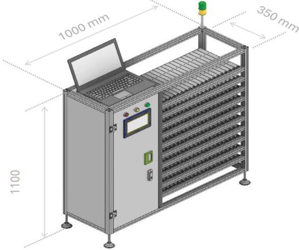 Next, a mechanical structure supporting the electric system is designed and presented in Figure. 8. This uses profile aluminum bars 40×40, combined with powder-coated steel sheets as an external cover. Total dimensions are 1100, 1000, and 350 mm, corresponding to height, length, and width. The grooved insulating panels containing the LED boards act as a support floor, separating the floors. Furthermore, an indication lamp is added to identify the device’s operation status.