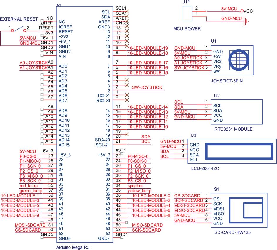 This section presents the necessary steps of the electronic circuit design process. First, the approach for the control schematics is introduced, as shown in Figure. 9. The control center is optically isolated from the power source of the LED modules and the relays controlling the alarm lamps in order to reduce the impact of signal noise. The modules, including the 3-signal pin joystick, the 20-column × 04-row LCD, the real-time clock (RTC 3231), and the microSD card, are directly connected to the Arduino Mega KIT (see Figure. 9). Two 5V power supply module types are employed: one to power the microcontroller, input expansion modules, LCD, RTC, and SD card, and the other to supply power to the high-power LED modules and fault classification modules. This design ensures the stable operation of the system during extended testing periods.