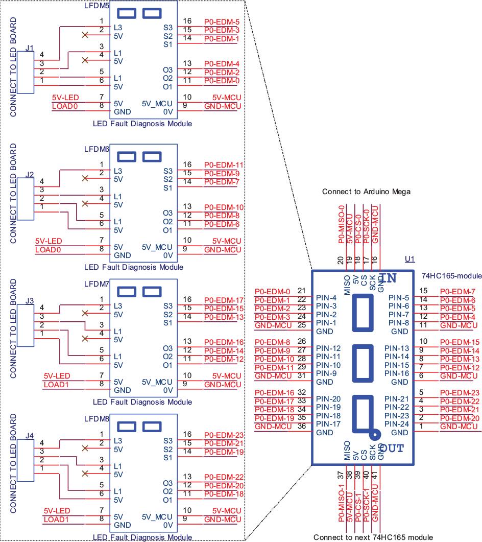 The next section of the design diagram illustrates the connection between the LED fault detection (LFD) modules and the input expansion modules based on the 74HC165 shift register. Each LFD module is capable of identifying the failure types of a three-LED board (open, short, and regular circuits). A pin expansion board consists of three 74HC165 chips, providing a total of 24 digital inputs, and is connected to four LFD modules (see Figure. 11). Therefore, for testing 200 LED boards, a total of 600 LFD modules and 50 pin expansion modules are required, which corresponds to 1200 digital data pins transferred to the Arduino Mega KIT.
