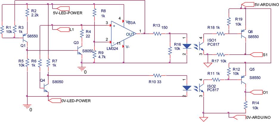 An LFD module consists of three testing clusters, with each cluster monitoring a single LED chip. The schematic diagram of the cluster is shown in Figure. 12. It is important to note that an op-amp LM324 is employed to determine whether the LED is experiencing a short circuit or is in normal operation. The classification threshold is set via the voltage divider network comprising resistors R8 and R9. Transistors Q4, resistors R6 and R7, are used to detect open-circuit LED faults. The results are communicated through two pins, 01 and S1, which indicate the following statuses: open circuit (if O1 is high and S1 is low), short circuit (if S1 is high and 01 is low), or normal operation (if both 01 and S1 are low). The ISO1 and ISO2 optocouplers provide electrical isolation for the test status signal before transmitting the S1 and 01 signals to the Arduino Mega KIT. This isolation ensures the stability of the central controller’s operation during prolonged testing periods.