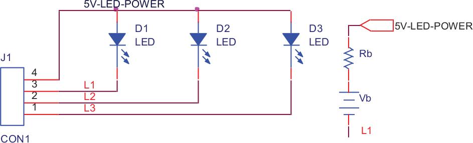 The schematic diagram of the LED module to be tested is shown in Figure. 13a. The LEDs are connected to a common anode, with the power pins (L1, L2, and L3) directly connected to the LFD module. The equivalent schematic diagram for a regular, forward-biased LED is presented in Figure. 13b, where the forward voltage VF = Rb. IF + V, with Vb representing the barrier voltage of the LED junction, and Rb denoting the internal resistance of the LED.