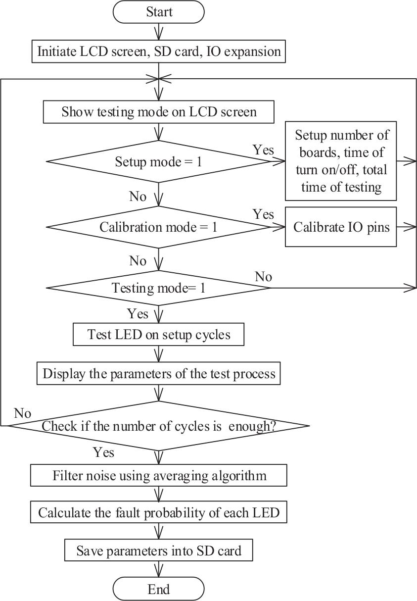 The primary control algorithm, as illustrated in Figure. 14, provides a clearer understanding of the device’s operation. There are three main operating modes: Setup Mode (i), Calibration Mode (ii), and Testing Mode (iii). In Mode (i), users can configure input parameters such as the number of boards to be tested, the LED “on” time (ton), the LED “off” time (toff), and the total testing time (tc). It should be noted that the number of LED testing cycles (nc) is calculated as follows: nc = ROUNDDOWN(tc / (ton + toff)), where ROUNDDOWN(.) denotes the floor function. In Mode (ii), users can perform diagnostics on the extended I/O ports without connecting to the LED modules. This mode enables the verification of the status of the extended ports and the identification of potential faults in the associated internal modules. Mode (iii) is the testing operation to determine whether LEDs are faulty or operational when connected to the device. In this mode, the LED modules are switched on and off cyclically. During the “on” state, the fault detection signal is sampled continuously at a frequency of 1 Hz throughout the “on” period (ton), which minimizes the impact of signal noise during testing. A parameter, referred to as the actual fault return frequency (fEi), is introduced and calculated as follows: fEi = nEi/nT, where nEi is the number of detected faults, nT denotes the total number of sampling acquisitions during the testing process, and i = 1, 2, …, 1200. It should be noted that nEi is computed as follows: