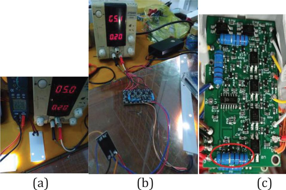 The fabrication process of the device consists of two primary stages: the experimental phase (i) and the manufacturing phase (ii). In the first stage (i), the fault classification module for a single LED unit is tested. This process involves conducting manual measurements to identify fault types and testing a prototype of the fault classification module, which is connected to a 3-LED board using a multimeter and a digital power supply (Topward 3303D). This procedure is illustrated in Figure. 15. It is important to note that the SMD 2583-426 LED module contains a single LED, whereas the SMD 2583-164 module contains three LEDs. These modules are not equipped with current-limiting resistors (refer to Figure. 13). The second stage (ii) entails the mass production of LFD modules and their integration with extended I/O modules, Mosfet LR7843-based PWM controller modules (HW-532), and the central controller (Arduino Mega 2560). The LED boards to be tested are systematically arranged across eight levels of a storage cabinet, with each level accommodating 25 LED boards. Each HW-532 module is employed to power 10 to 12 LFD modules. This module was selected due to its resistance characteristics, with RDS(on)max = 3.3 mΩ, leading to a voltage drop across the power module is low, VDS(on) = RDS(on)max × Imax ≈ 0.043 V. Four 5VDC, 20Apower supplies are evenly distributed to supply power to the eight levels of LED boards (200 3LED-boards) and the 200 LFD boards. The power supply, with Vp = 5V, was selected due to its widespread industrial adoption and compatibility with the forward voltage of the LED chip. The current per three-LED board, I3LB max, is limited to 350 mA. Consequently, the maximum average current per LED is given by IF max = 3LB max/3. The total peak power of the device, PD max = 600IF maxVP = 350W, remains within safe operational limits. Although the chosen 400W total power is not fully optimized, it ensures a reliable safety margin for the system.