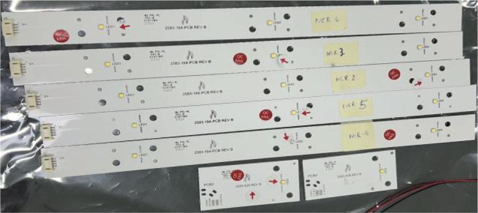 Sample of faulty LED boards (2583-164-PCB-REV B).