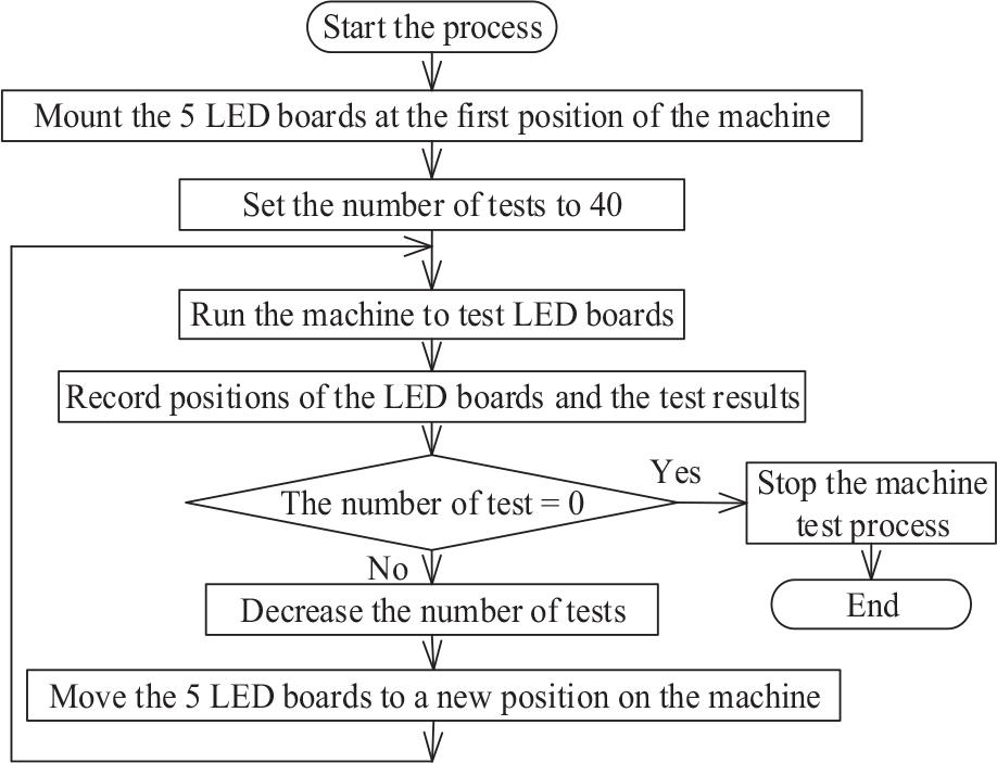 To further evaluate the device before completion, we tested some samples sent by customers. The number of sample boards used for testing the device is 5 (for 3-led boards), named NCR1 to NCR5 and illustrated in Figure. 18. First, these sample LED boards manually tested each LED by using the multimeter for resistor measurement and the digital power supply to track consumed current, to determine the fault types. Then, they are connected to only one individual LFD module and the digital power source to confirm. This process is to claim that the faulty kind of sample boards are exact. Results are summarized in Table 1. It is noted that the returned output values of the LFD module are shown in this table, where Oi and Si indicate “open state” and “short state” correspondingly (i = 1, 2, 3). Next, five sample boards are attached to the manufactured testing device, and the position of the connector jacks is marked. The device is activated, and the testing results are compared to the sample set. Figure. 19 illustrates the diagram of the testing process. The test results are performed 40 times with a shortened time of 2 minutes ON time and 1 minute OFF time. This test is because the number of boards with broken LEDs is limited. The test time is shortened compared to reality, but the number of tests performed has increased (up to 40 times). The positions not connected to the LED boards are considered open circuit fault board one during the test.