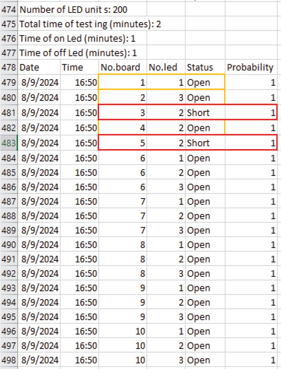 The results of the individual tests are presented in Figure. 20. The key parameters include the test date and time, the circuit board position, the LED location, the test status, and the probability of meeting the required criteria. It is important to note that the probability of meeting the criteria is calculated as the ratio of successful trials to the total number of tests conducted. This value corresponds to fEi as mentioned in Section 3.3. The test status is determined during the period when the LED is illuminated. Due to measurement noise, this parameter may not reach a value of 1, but it reflects the reliability of the test results. Experimental results demonstrate that the device’s trial runs accurately identified errors on the sample LED boards, including LED location, board position, and fault type. A total of 40 tests were performed, all of which met the required criteria.