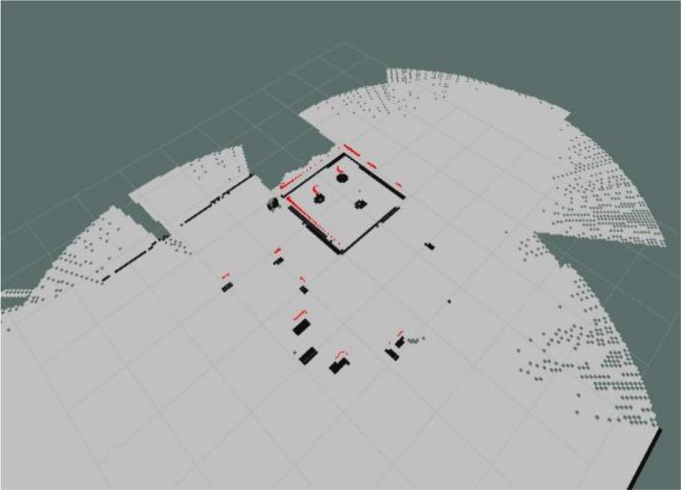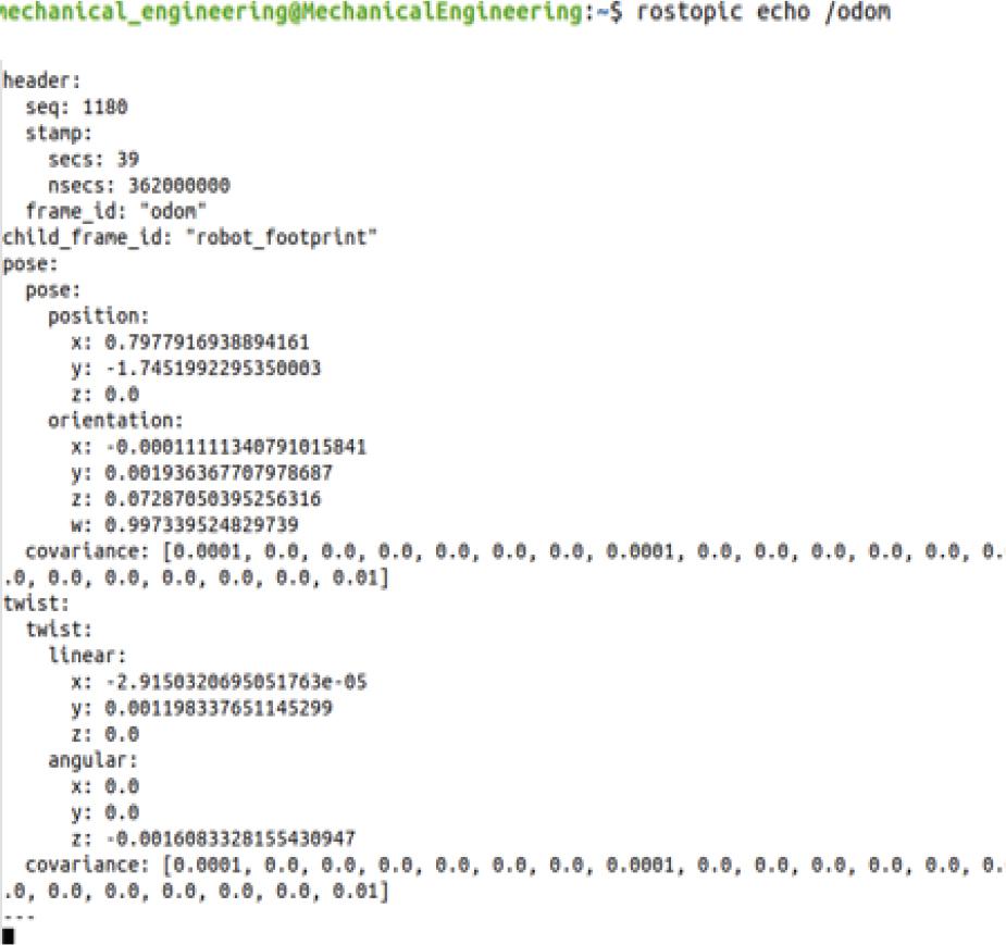 For precise and autonomous navigation, the AMR employs a SLAM system, implemented through the slam_gmapping ROS package. This system uses LiDAR and odometry data to generate real-time maps, allowing the robot to navigate dynamic layouts without human intervention. Fig. 7 illustrates the detailed maps created during Gazebo simulations, which enabled high-accuracy navigation across various environments. The SLAM process achieved localization accuracy within 2 cm during real-world testing, as highlighted by odometry data in Fig. 8. This precision is crucial for safe operations in manufacturing environments with constantly changing layouts and mobile obstacles like equipment and personnel.