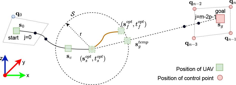 To ensure the real-time performance and feasibility, the consuming time of trajectory generation needs to be limited within a time interval of δ(t). This is achieved by generating only the portion of the trajectory (illustrated by Fig. 2, it is the golden-brown segment) that lies within a sphere 𝒮 with the radius r. During re-planning, r remains fixed. The trajectory generation starts at a time when UAV is staying at sc and at the moment before the time of completing the execution of the previous portion of the trajectory by δ(t) (illustrated in Fig. 2).