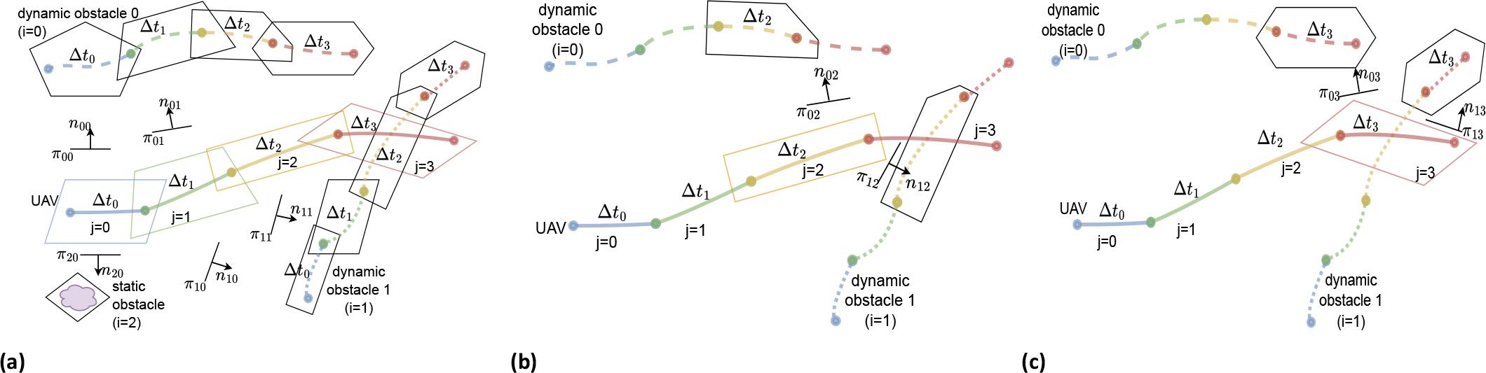 Outer representation of trajectories of UAV, dynamic obstacles (for instance, obstacle 0 and 1), static obstacle (for example, obstacle i = 2) and Collision-checking by separating planes πij: (a) Collision-checking at the 1st and 2nd interval of UAV trajectory. (b) Collision-checking at the 3rd interval of UAV trajectory.(c) Collision-checking at the 4th interval of UAV trajectory