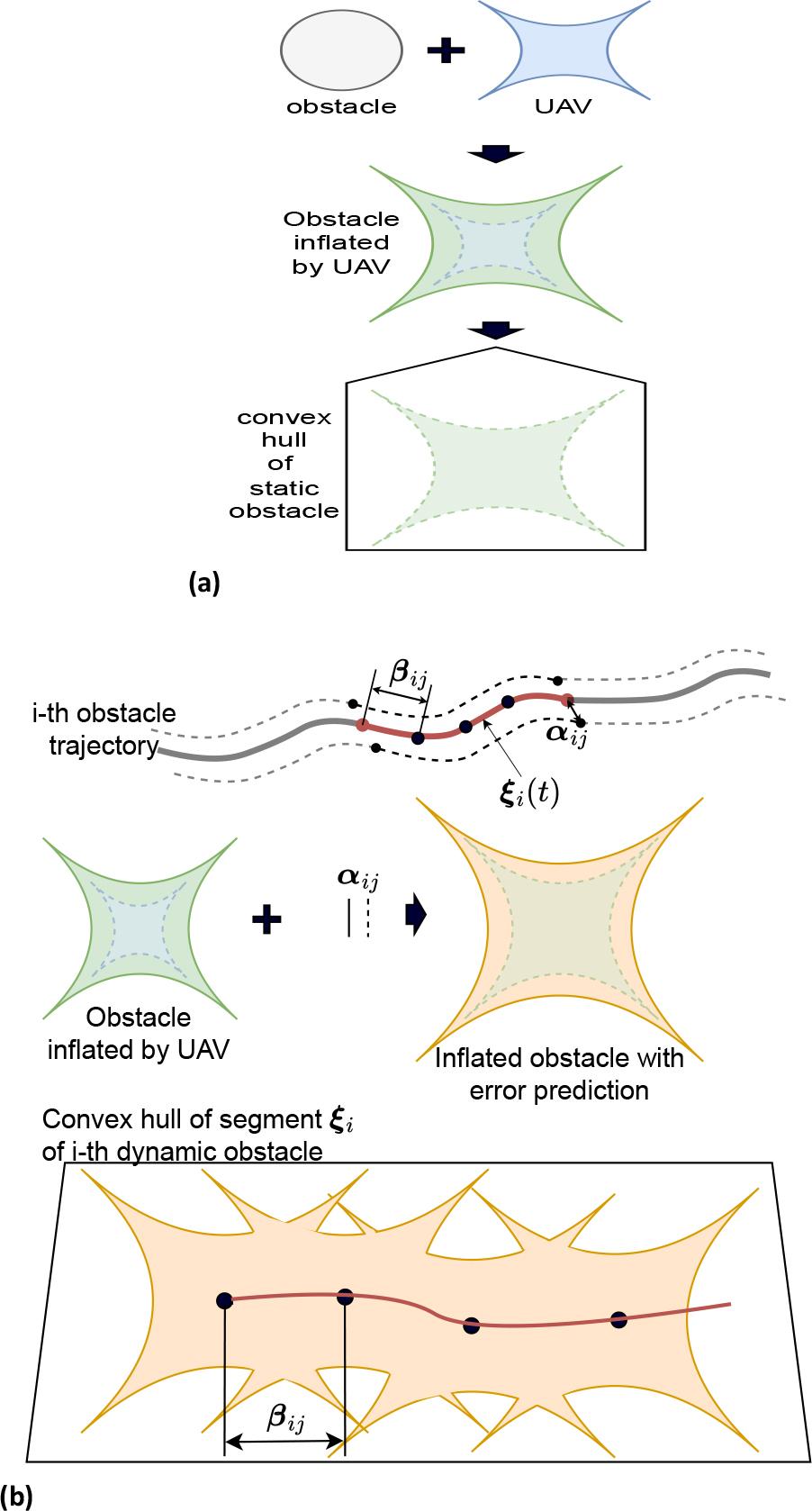 For dynamic obstacles, its trajectory is predicted segment by segment with the prediction error αij (illustrated by Fig. 4b). Each segment of i-th obstacle’s trajectory, ξij(t), is corresponding to a j-th interval time Δtj of the UAV’s trajectory. In this case, the convex hull is calculated as follows: First, it is inflated by the UAV’s size, similar to a static obstacle. Next, it is expanded with the prediction error αij. Then, it is slid along its predicted trajectory with a sampling time of βij. The entire occupied space of the obstacle,