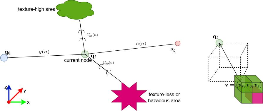 So, at this time, the total cost function f(.) includes four terms, where g(.) is the sum of the distances (between successive control points) from q0 to the current node ql (cost-to-come), h(.) is the distance from the current node ql to the goal sg (heuristics of the cost-to-go), Crep(.) is for repelling UAV away from the low-texture regions, while conversely, Catt(.) is for attracting towards informative areas, as modeled in Eq. 2.