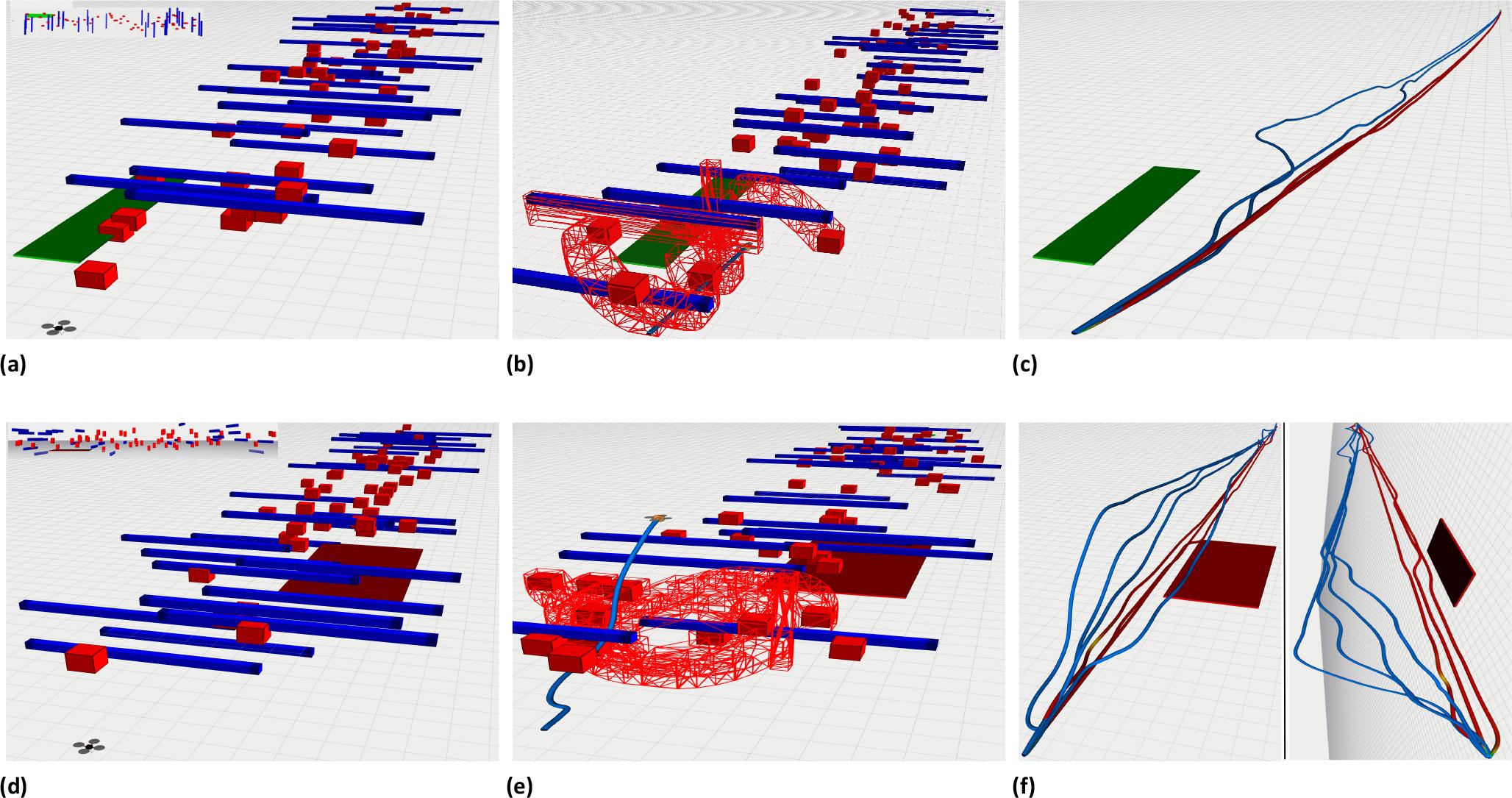 Similarly, in the second scenario, considering the low-texture or hazardous area corresponds to λrep = 2.0. The resulting trajectory shows that the UAV tends to avoid these regions (the dark blue trajectory in Fig. 7f), while still successfully reaching the goal within the dynamic environment (Fig. 7e).