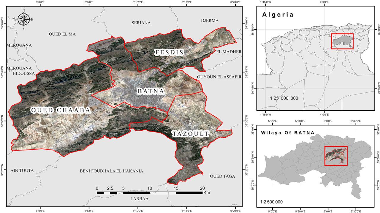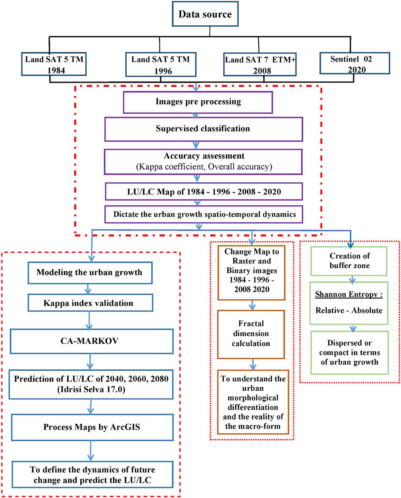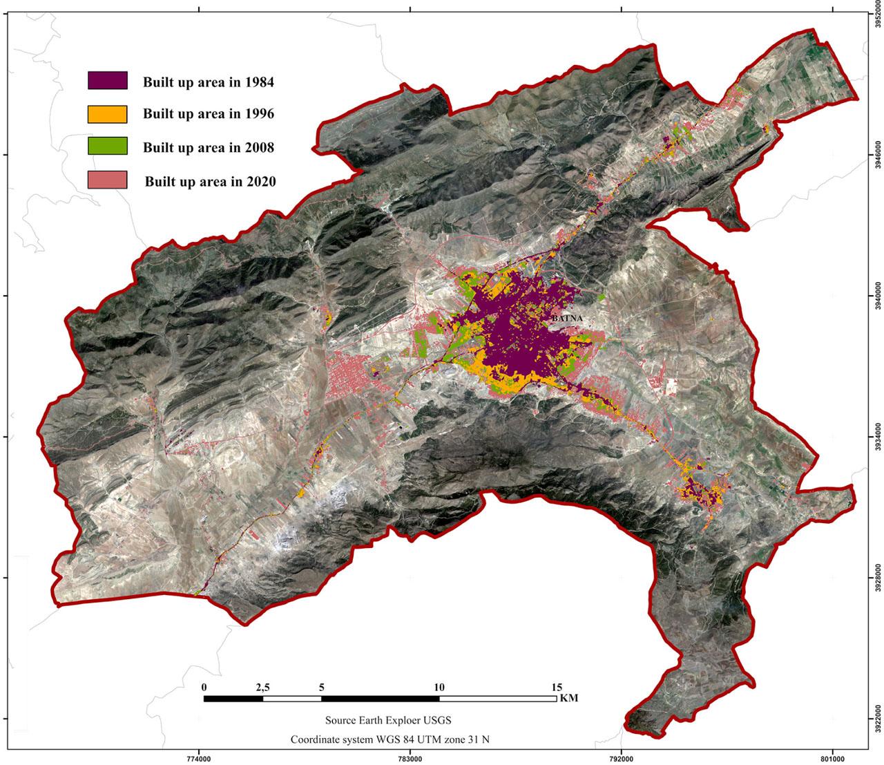 Average annual rate of change of the urban extension (VT), urbanisation intensity index (UII), dynamic degree of urban expansion (K) of the inter-municipal grouping of Batna between 1984 and 2020_