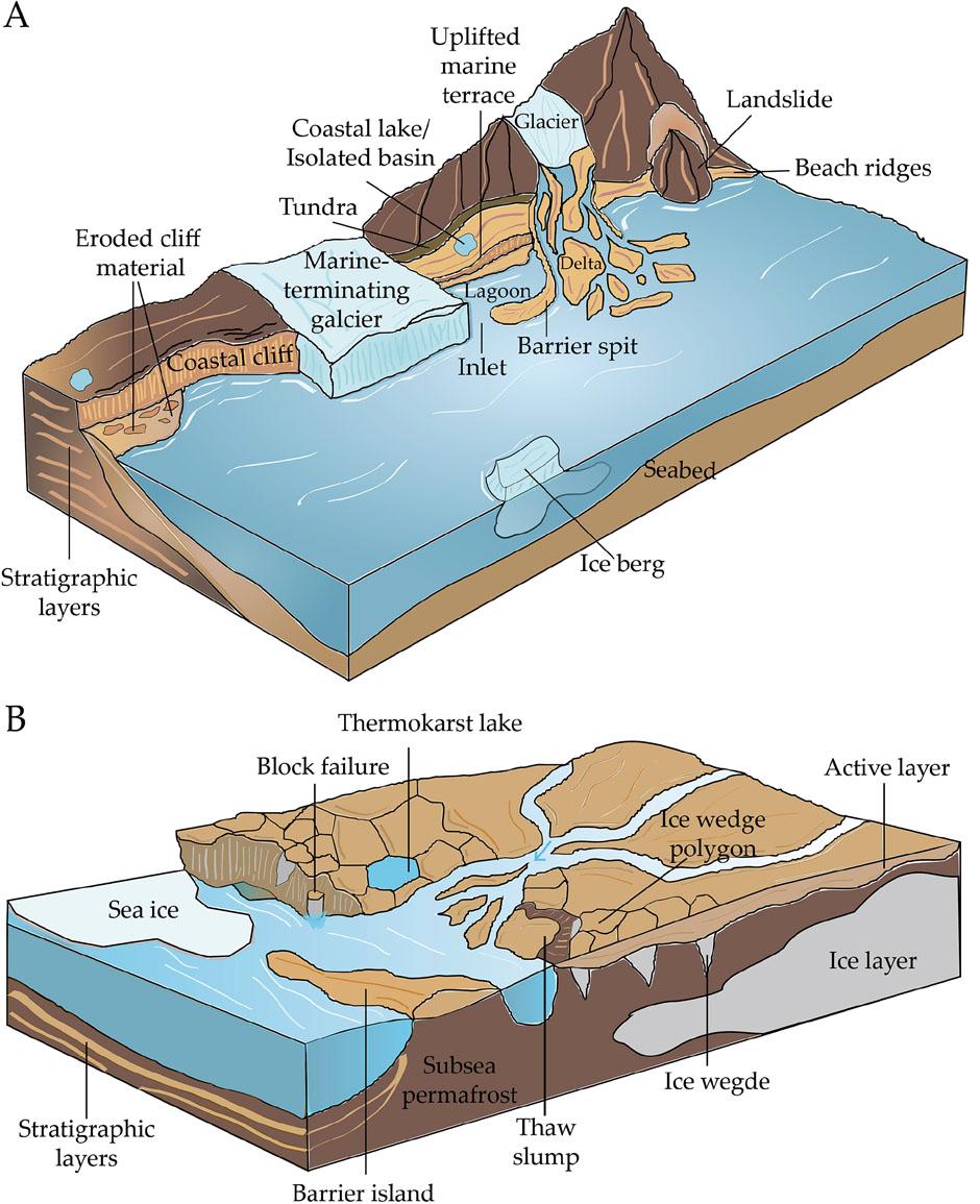 The permafrost coast in the Arctic makes up more than 30% of Earth’s coastline (Lantuit et al. 2011b). Attempts to determine the extent of permafrost in the Northern Hemisphere were made by Obu et al. (2019), Obu (2021). According to their study, almost 22% of the exposed land is permafrost, of which more than half is continuous permafrost, and the remainder comprises discontinuous, sporadic, and isolated patch zones (Obu et al. 2019). Intensified thawing of subsea, coastal, and inland permafrost is one of the major factors contributing to the rapid retreat of Arctic coasts (Strzelecki 2011a). Erosion often has a form of ice-wedge polygons block failures or thaw slumps (Fig. 2B) (Berry et al. 2021). Recent projections suggest that by 2050, 70% of the coastal infrastructure in the permafrost domain is expected to face a direct threat posed by permafrost degradation (Hjort et al. 2018), while the pan-Arctic coastal erosion is likely to double by the end of this century (Nielsen et al. 2022).