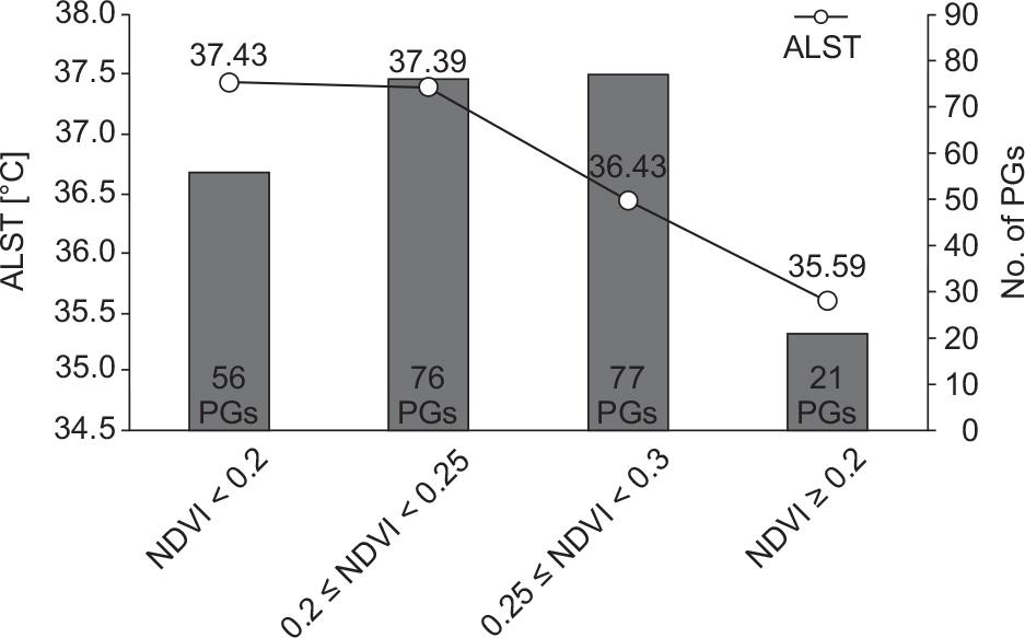 | Statistics | Group 1 PGs with high ANDVI (≥0.25) and below average ALST (<36.83; N = 76) | Group 2 PGs with high ANDVI (≥0.25) and above average ALST (>36.83; N = 29) | Group 3 PGs with low ANDVI (<0.25) and above average ALST (>36.83; N = 84) | Group 4 PGs with low ANDVI (<0.25) and below average ALST (<36.83; N = 41) |