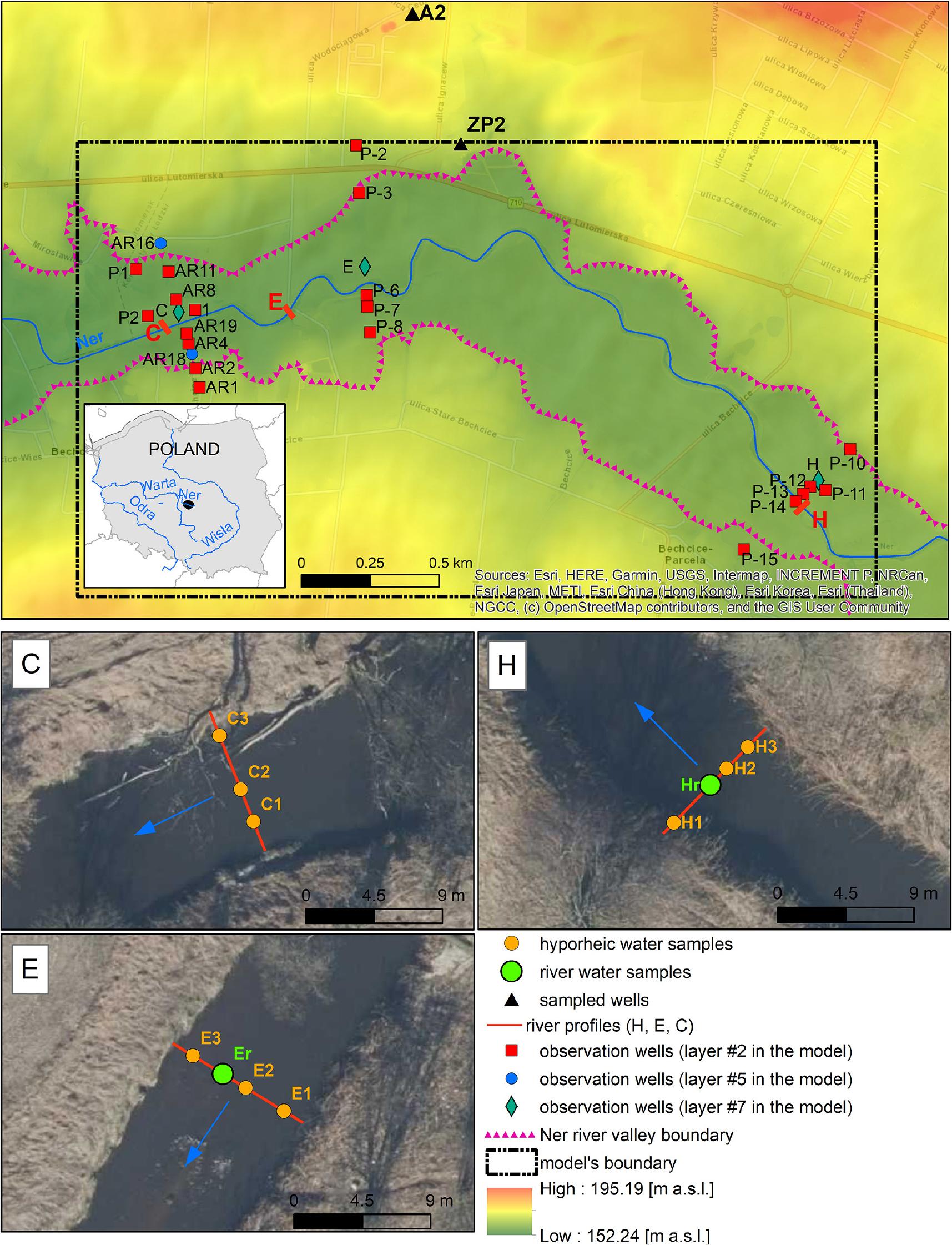This study aims to characterise the hydrodynamic and hydrochemical properties of the HZ of the Ner River, impacted heavily by anthropogenic influences, including significant sewage inflow and its occurrence within confirmed zones of river water infiltration into deeper aquifers. Groundwater flow modelling identified riverbed segments with high HEF rates. Chemical analyses validated hydrodynamic findings and provided insights into HZ differentiation in terms of water mixing and chemical processes. An important, also practical goal of the conducted research was to determine whether highly polluted sewage, through the deposition of suspensions and sewage sludge, caused clogging of the river bottom, reducing its roughness, which would significantly limit the exchange of surface water with groundwater, and thus limit the self-purification process of the river. This case study contributes also to the broader understanding of the processes that occur in the HZ but their effect can be observed beyond the reach of this zone, especially when the context related to the flow conditions of the aquifers, their hydraulic interactions and the fact that the river valley is affected by groundwater withdrawals of significant importance to the municipal economy of the region, is taken into account. The presented research is the continuation of work done in previous years regarding the identification of river valley areas that threaten the chemical status of groundwater. These studies conducted in the Upper Ner basin showed the existence of a risk of releasing pollutants accumulated in the near-surface zone as a result of changes in pressure gradients in the aquifers (Krogulec et al. 2024).