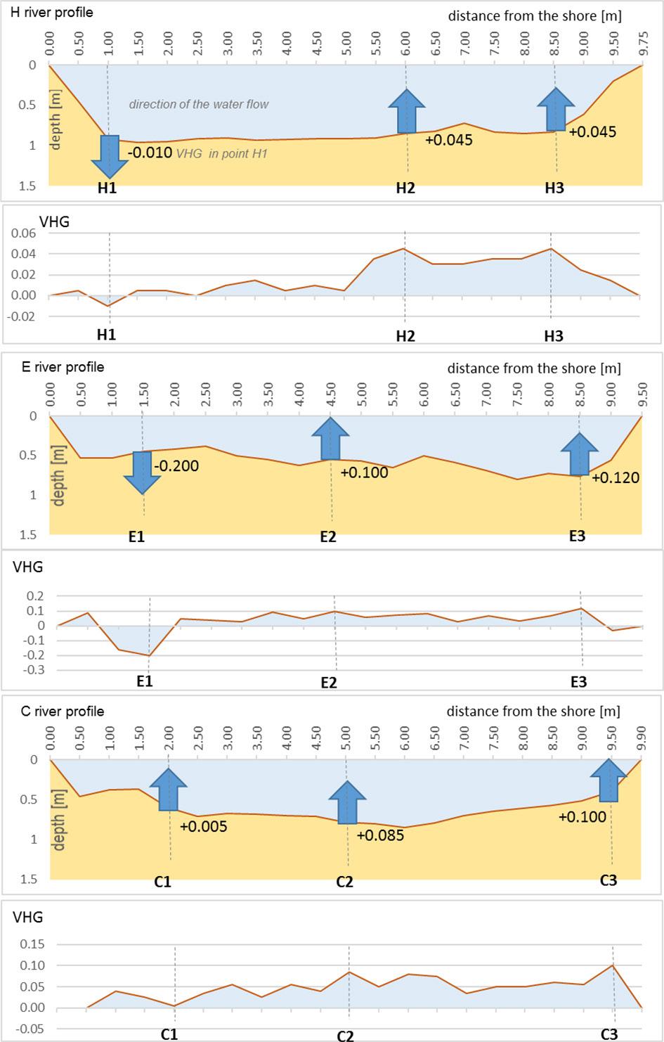 The results of the bottom sediment permeability indicate good or locally medium permeability, which significantly promotes HEF. The hydraulic conductivity in the studied profiles reaches a maximal value of 3.45 · 10−4 m · s−1, with an average of 2.40 · 10−4 m · s−1. Lower values, on average 3.59 · 10−5 m · s−1, characterise points located in the flank zone of the riverbed, in the H1 and C1 profiles and in the middle part of the E profile, at the E2 point.