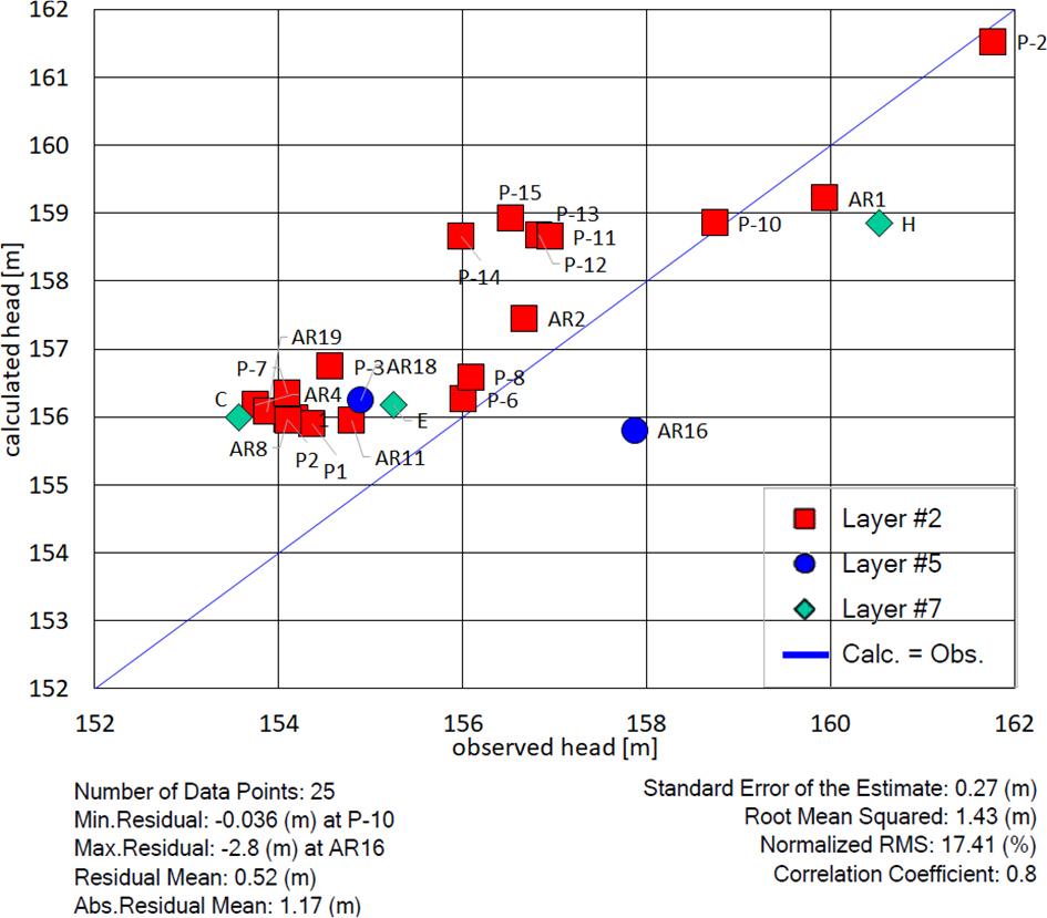 The process of calibrating the flow model involved finding a solution to an inverse model, the results of which were compared with data measured directly in the field. Calibration was performed for 25 points, representing all aquifers: 20 points for the subsurface aquifer (Layer #2), 2 points for the lower Quaternary aquifer (Layer #5) and 3 points for the Upper Cretaceous aquifer (Layer #7) (Fig. 3).