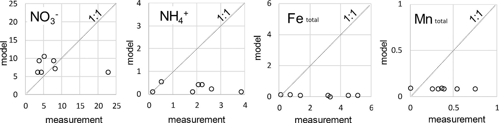 Under the defined hydrodynamic conditions, the proportion of river water in the HZ, as determined by chloride concentrations, ranged from 2.11% to 21.45%, with higher values observed in areas where VHGs were negative, indicating downwelling. The comparison of mixing results between surface water and groundwater with the laboratory-determined chemical composition of the HZ waters revealed interesting insights. Specifically, there was a distinct enrichment of HZ waters in iron (Fe) and manganese (Mn) ions (Fig. 5). Notably, the E1 measurement point showed intensive infiltration of river water into the alluvium, indicated by a VHG of –0.200 m · m−1.