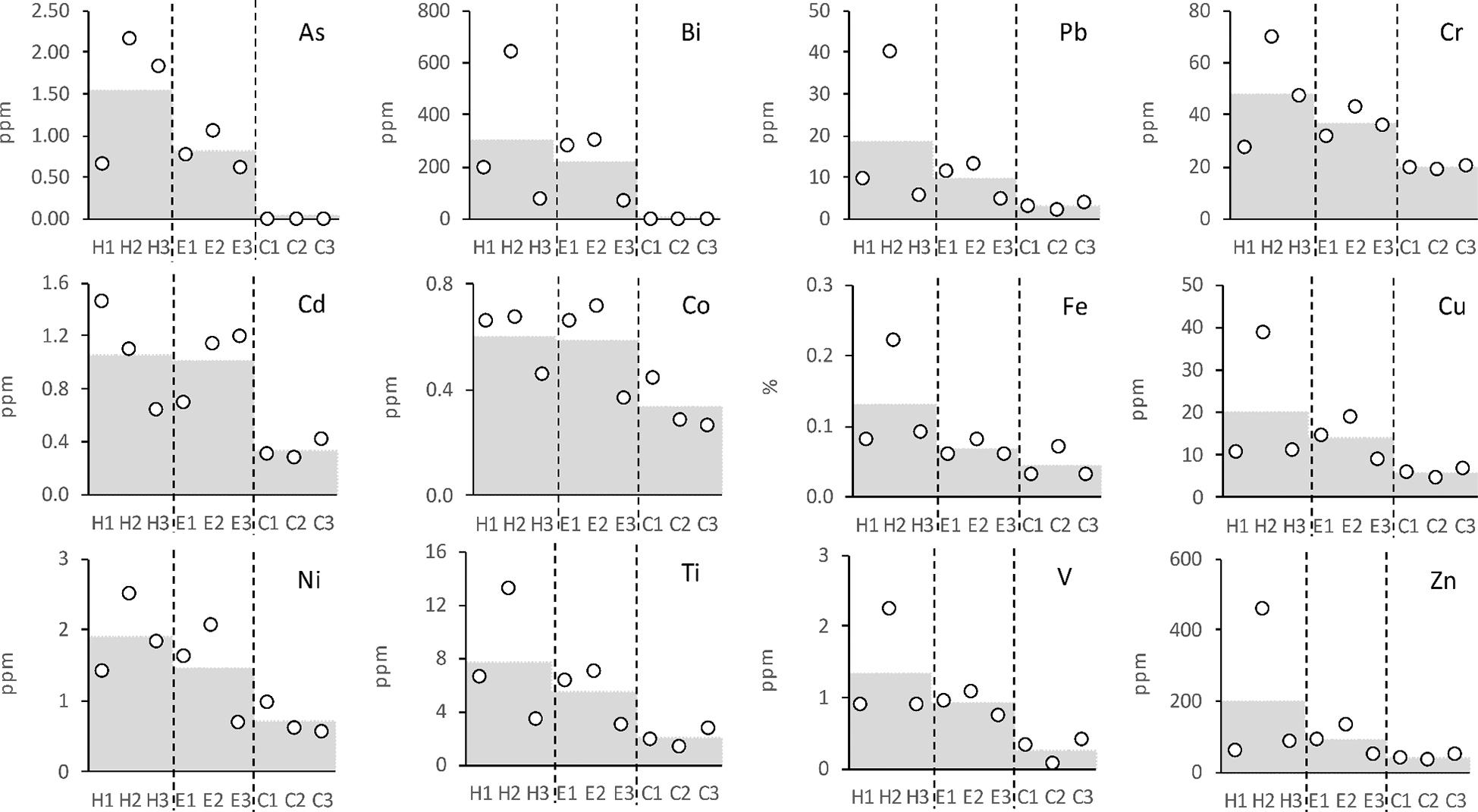 Concentrations of selected elements in the alluvium of Ner River (average values for each profile studied shown in grey).