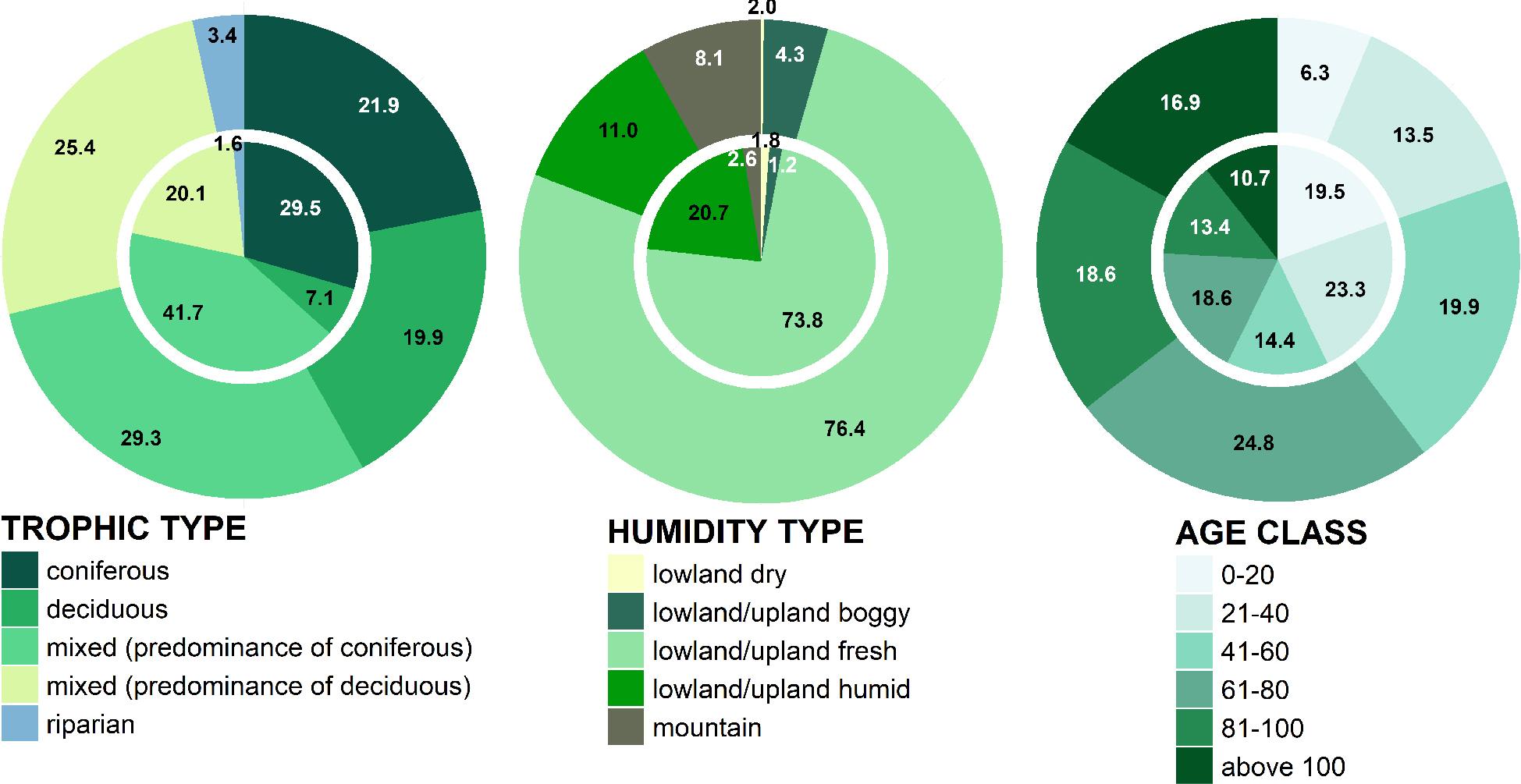 The division into classes was based entirely on the classification of State Forests due to the possibility of using the results to plan further activities within the framework of forest management and fire protection measures. Trophic (coniferous, mixed with coniferous dominance, mixed with deciduous dominance, deciduous, riparian) and humidity (lowland/upland boggy, lowland/upland humid, lowland/upland fresh, lowland dry, mountain) types were directly obtained from the classification of State Forests, and age classes (0–20, 21–40, 41–60, 61–80, 81–100, >100) were categorised to align with reporting standards recognised by State Forest.