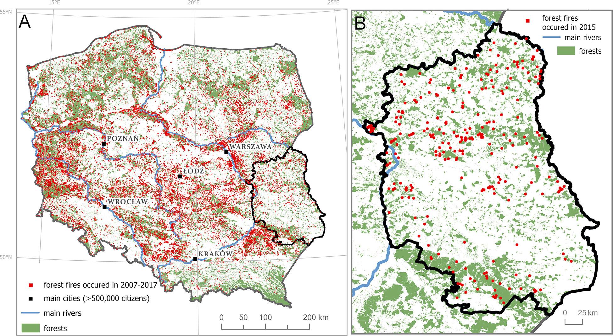 Forest fires occurred in 2007–2017 in Poland (A) and in 2015 in Lubelskie Voivodeship (B).