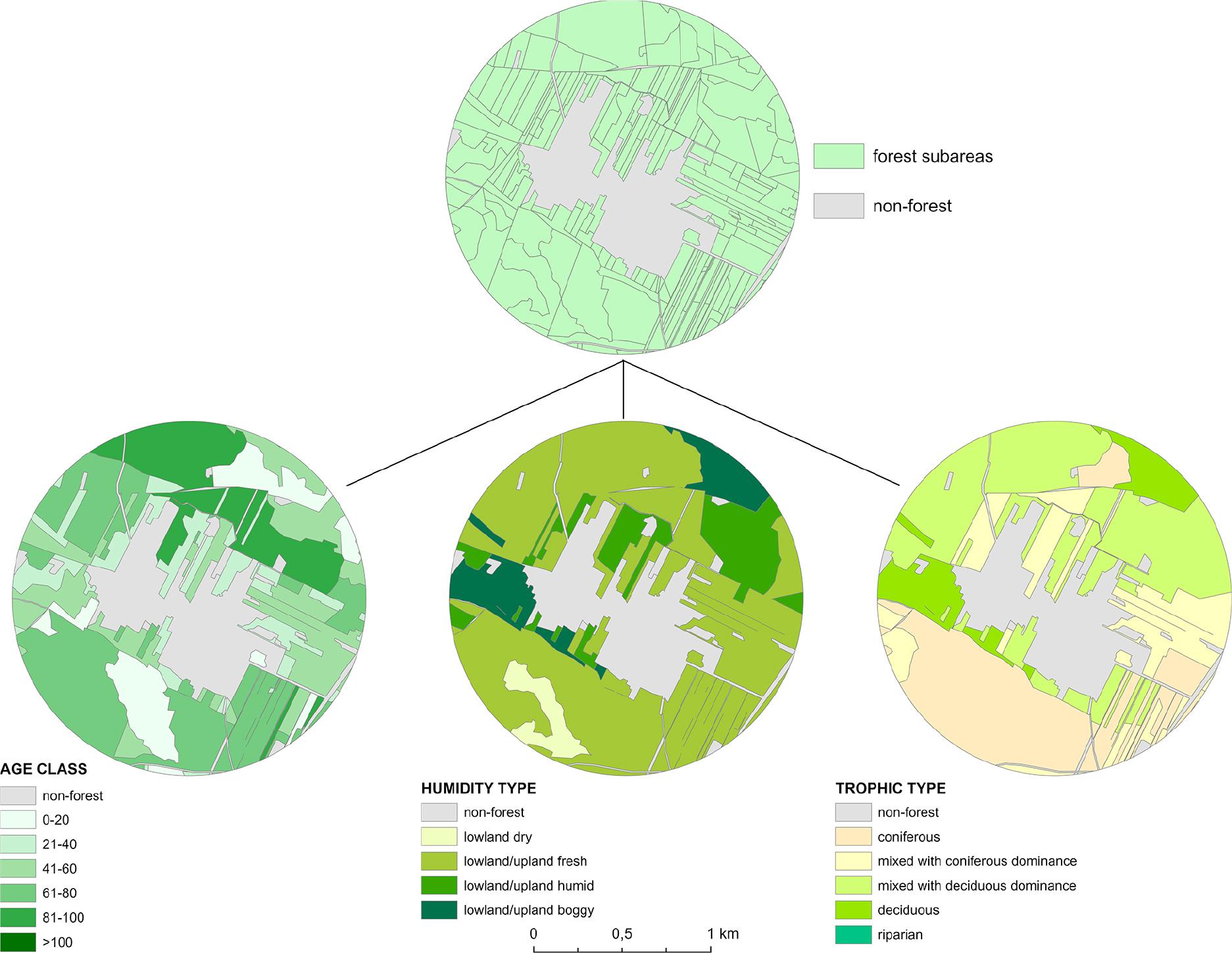 The FDB layer was clipped using the buffer zones, and then adjacent patches with the same attributes were merged for age, moisture, and trophic attributes (Fig. 3). Non-forest areas were also merged into one class.