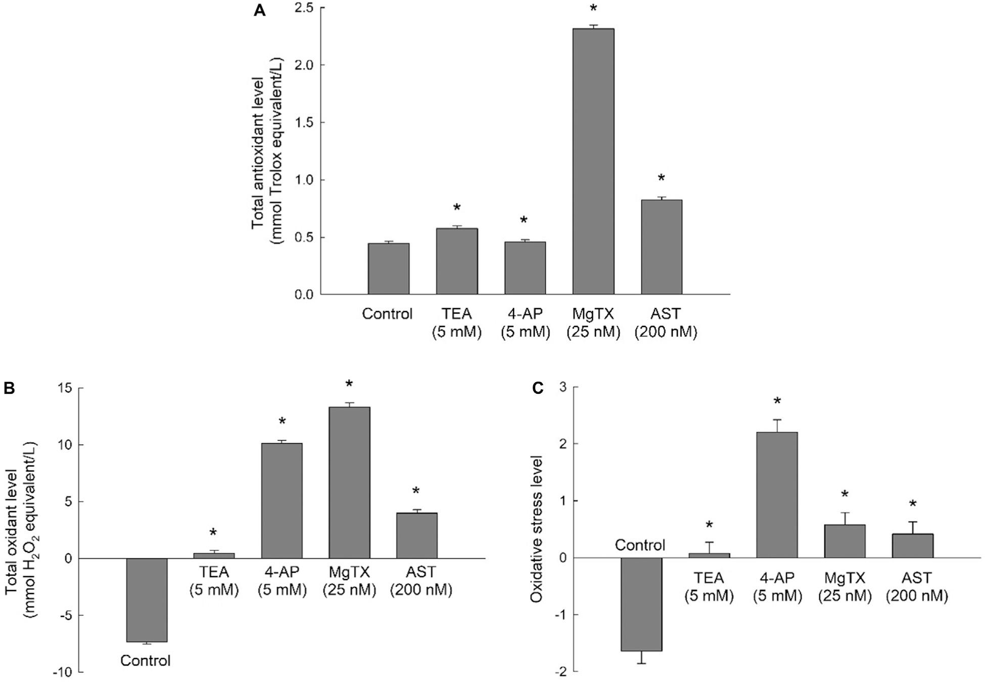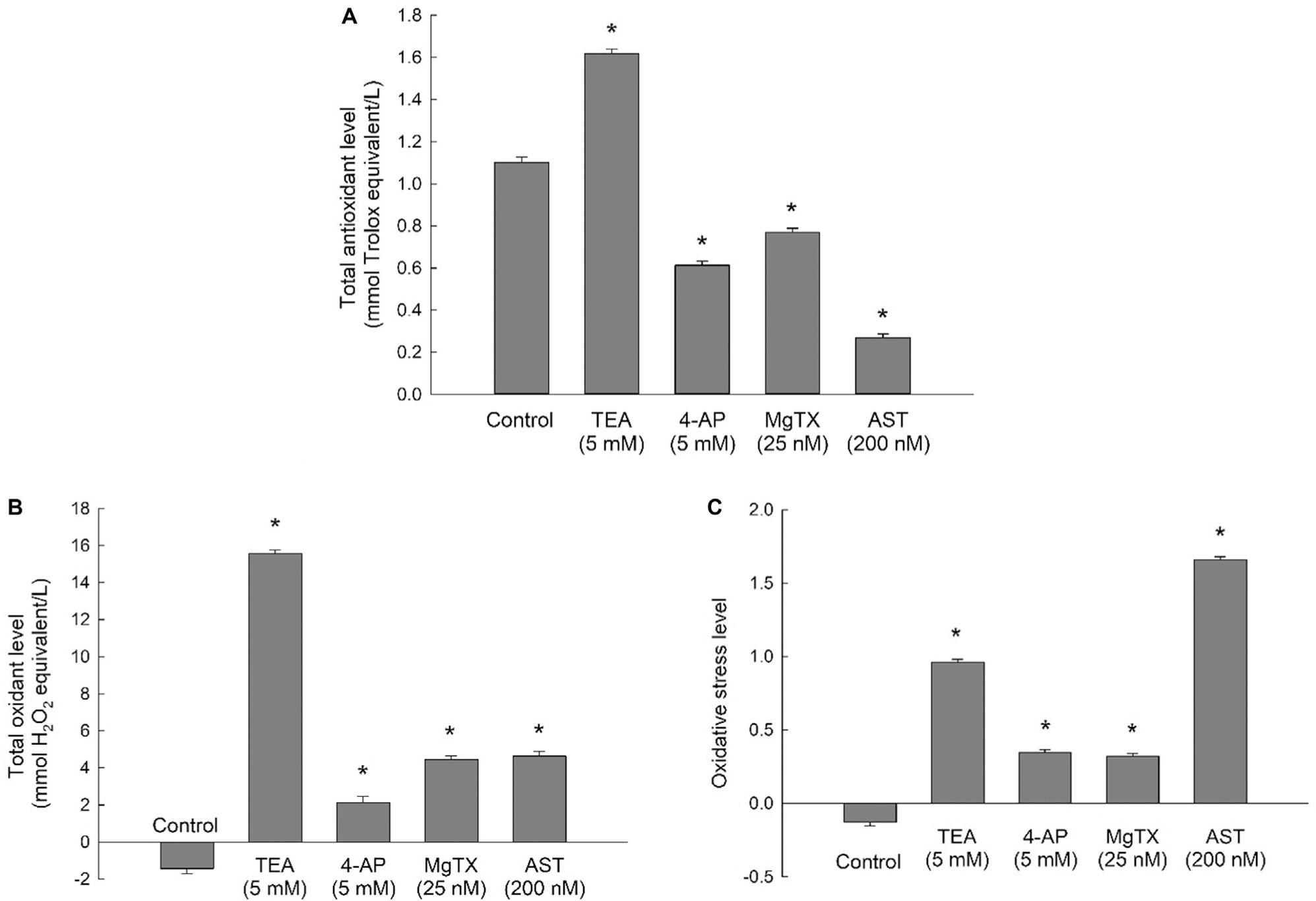 In MDA-MB-231 breast cancer cells, the total antioxidant levels were increased significantly compared with the control group after treatment with 5 mM TEA, 5 mM 4-AP, 25 nM MgTX, or 200 nM AST (Figure 2A). Furthermore, the total oxidant levels were increased significantly compared with the control group in MDA-MB-231 cells treated with 5 mM TEA, 5 mM 4-AP, 25 nM MgTX, or 200 nM AST (Figure 2B). According to the formula (Eq. 1), the oxidative stress was increased significantly compared with the control group in MDA-MB-231 cells treated with 5 mM TEA, 5 mM 4-AP, 25 nM MgTX, or 200 nM AST (Figure 2C).