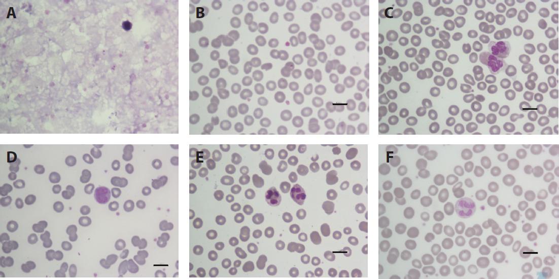 (A and B) Both thick and thin blood films showing a ring form of Plasmodium falciparum parasite with normal finding of red blood cells (RBCs) on the first day of admission. (C) Peripheral blood film from the fourth day after antimalaria treatment. The RBCs, leukocytes, and platelets are normal. (D) Peripheral blood film showing RBCs with autoagglutination and microspherocytosis. (E) On the fifth day after steroid treatment, some clumping of RBCs is seen on peripheral blood film. (F) Peripheral blood film showing RBCs, leukocytes, and platelets are normal at the second week after steroid treatment. All scale bars indicate 10 μm.