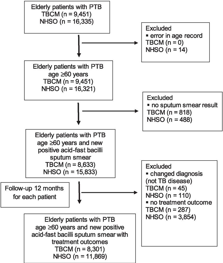 Diagram of elderly patients with pulmonary tuberculosis (PTB) in Thai TB Case Management (TBCM) database from October 1, 2013, to September 30, 2015, and in Thai National Health Security Office (NHSO) database from October 1, 2009, to September 30, 2011