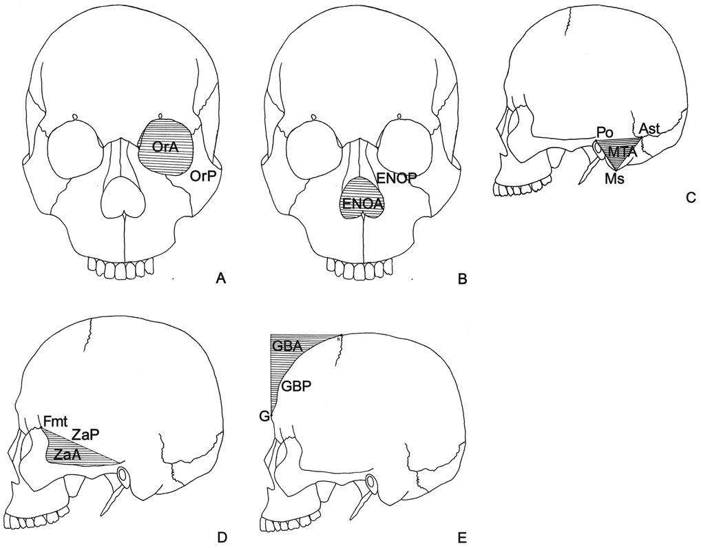 | GBA§ | Glabella-bregma area | Area of space between the straight line drawn through bregma in the horizontal plane and perpendicular to the straight line drawn through the glabella in the vertical plane |