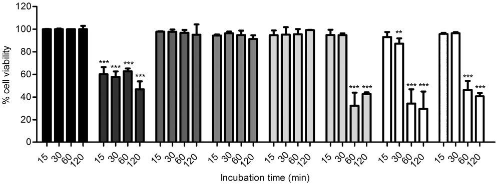 Effect of local anesthetics on viability of CHON-001 cells after 15-, 30-, 60-, and 120-min exposure as determined by FITC-conjugated annexin V and PI staining and cytometry using a Beckman Coulter Epics XL flow cytometer. The sets of bars represent the mean percentages of chondrocyte viability after treatment with local anesthetic or controls; from left to right, PBS vehicle control (black bars), 0.4 mM H2O2 positive control (dark-gray bars), 0.25% ropivacaine (medium-gray bars), 0.5% ropivacaine (medium-gray bars), 0.25% levobupivacaine (light-gray bars), 0.5% levobupivacaine (light-gray bars), 0.25% bupivacaine (white bars), 0.5% bupivacaine (white bars). Low (0.25%) and high (0.5%) concentrations of bupivacaine and 0.5% levobupivacaine treated groups significantly decreased cell viability at 60 min, compared with treatment by the PBS vehicle control. **P < 0.001, ***P < 0.001; error bars represent standard deviation; FITC, fluorescein isothiocyanate; PBS, phosphate-buffered saline; PI, propidium iodide