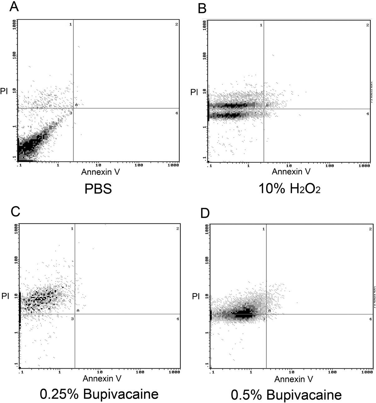 Pattern of CHON-001 cell death after 120 min exposure to local anesthetics as analyzed using a Beckman Coulter Epics XL flow cytometer after staining with annexin V-conjugated FITC and PI. Compared with chondrocytes treated with PBS vehicle as a control (A), the numbers of necrotic chondrocytes increased after treatment with 0.25% bupivacaine (C), 0.5% bupivacaine (D), 0.4 mM H2O2 positive control (B) FITC, fluorescein isothiocyanate; PBS, phosphate-buffered saline; PI, propidium iodide