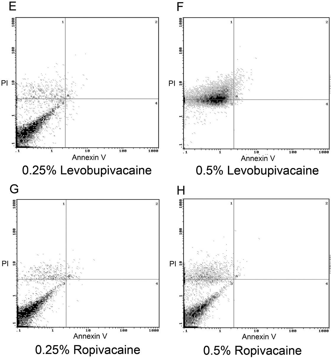 Pattern of CHON-001 cell death after 120 min exposure to local anesthetics as analyzed using a Beckman Coulter Epics XL flow cytometer after staining with annexin V-conjugated FITC and PI. The numbers of necrotic chondrocytes increased after treatment with 0.25% levobupivacaine (E), 0.5% levobupivacaine (F), while chondrocytes treated with ropivacaine (G, H) showed no substantial difference in cell viability compared with those treated with PBS vehicle as a control (A). FITC, fluorescein isothiocyanate; PBS, phosphate-buffered saline; PI, propidium iodide