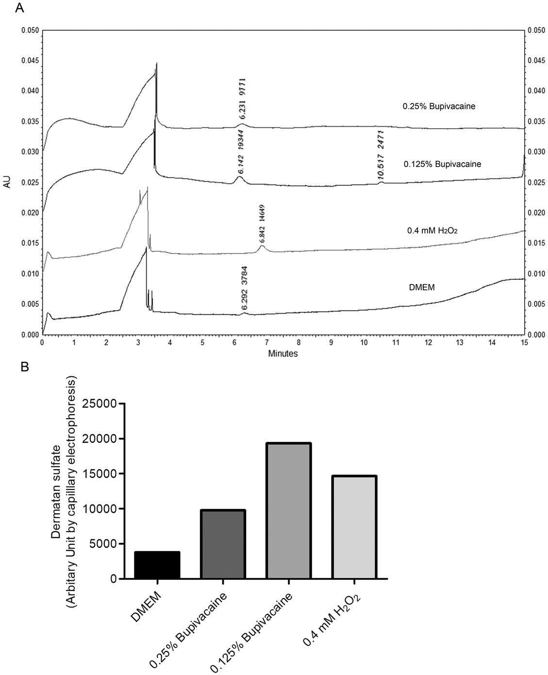 Production of dermatan sulfate by bupivacaine-treated CHON-001 cells as determined by a Beckman Coulter P/ACE MDQ capillary electrophoresis system equipped with a photodiode array detector operating at 195 nm (AU). (A) Dermatan sulfate production by chondrocytes treated with 0.125% bupivacaine for 24 h was greater than production by chondrocytes treated with 0.25% bupivacaine for 24 h. Labeled peaks correspond to dermatan sulfate showing migration time (min) and relative area under the peak (arbitrary units). Treatments for 24 h as indicated. (B) Bars show the relative increase in dermatan sulfate production by the chondrocytes after the various treatments including both concentrations of bupivacaine (single measurements). AU, arbitrary units; DMEM, Dulbecco’s modified Eagle’s medium