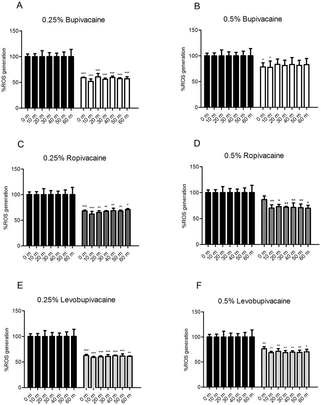 ROS production by CHON-001 cells after exposure to local anesthetics for 0–60 min as determined by 2′,7′-dichlorodihydrofluorescein diacetate reagent. The chondrocytes were treated with PBS vehicle as a control (black bars), bupivacaine (white bars) 0.25% (A) and 0.5% (B), ropivacaine (dark-gray bars) 0.25% (C) and 0.5% (D), levobupivacaine (light-gray bars) 0.25% (E) and 0.5% (F). The local anesthetics immediately decreased ROS production compared with PBS. *P < 0.05, **P < 0.01, and ***P < 0.001; error bars represent standard deviation m, minutes; PBS, phosphate-buffered saline; ROS, reactive oxygen species