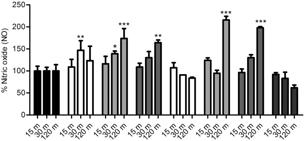 NO production by CHON-001 cells after exposure to local anesthetics for 120 min as measured by using a colorimetric Nitrite/Nitrate Assay kit. The bars represent the mean NO production after treatment with PBS vehicle as a control (black bars), bupivacaine (white bars, 0.25% left, 0.5% right), levobupivacaine (light-gray bars, 0.25% left, 0.5% right), ropivacaine (medium-gray bars, 0.25% left, 0.5% right), and 0.4 mM H2O2 (dark-gray bars, far right). *P < 0.05, **P < 0.01, and ***P < 0.001; error bars represent standard deviation; m, minutes; NO, nitric oxide