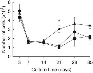 Growth kinetics of rat mesenchymal stem cells cultured in hydrogels. Squares indicate hydrogels made of 4% silk fibroin (SF) solution only (SF hydrogel), circles indicate hydrogels made of 4% SF solution + 0.05% collagen solution (SF/0.05C hydrogel), and triangles indicate hydrogels made of 4% SF solution + 0.1% collagen solution (SF/0.1C hydrogel). Error bars are standard deviations of triplicate experiments.