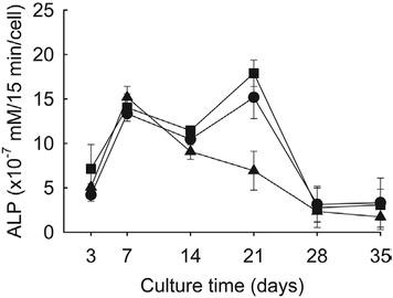 Alkaline phosphatase (ALP) activity of rat mesenchymal stem cells cultured on hydrogels in osteogenic induction medium. Units indicate mM p-nitrophenol produced per min per cell. Squares indicate hydrogels made of 4% silk fibroin (SF) solution only (SF hydrogel), circles indicate hydrogels made of 4% SF solution + 0.05% collagen solution (SF/0.05C hydrogel), and triangles indicate hydrogels made of 4% SF solution + 0.1% collagen solution (SF/0.1C hydrogel). Error bars are standard deviations of triplicate experiments.