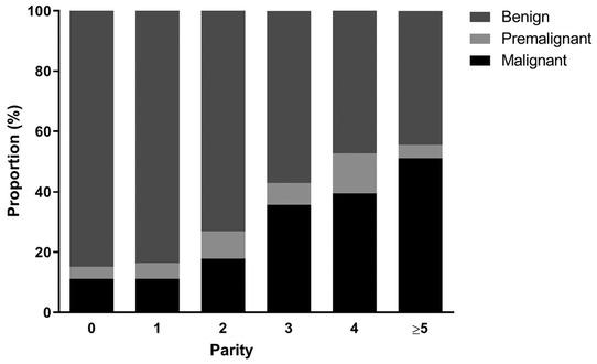 Proportion of premalignant and malignant lesions in different parity.