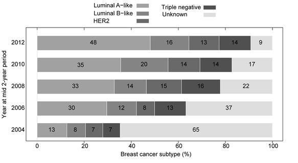 Distribution of breast cancer subtypes by age, stage and year of diagnosis (2004–2013)