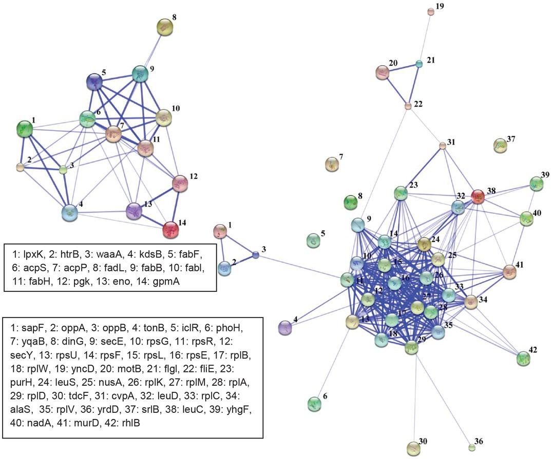 Interaction network of matched categories for (left) Staphylococcus aureus ATCC 25923 and (right) Escherichia coli ATCC 25922. Thicker lines indicate higher confidence and higher number of interactions described by String database.