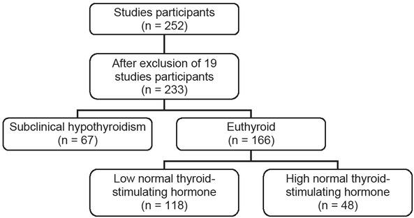 Characteristics, laboratory findings, and Zulewski scores among the 2 euthyroid groups with different TSH levels_ Bold numbers indicate significant P