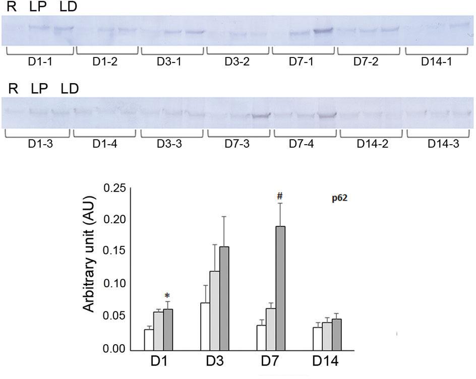 p62 protein in the right (R) (white bar), left proximal (LP) (light gray bar), and left distal (LD) (dark gray bar) sciatic nerves of rats sacrificed at day 1 (D1), day 3 (D3), day 7 (D7), and day 14 (D14) after nerve crush (n = 7 for each time point). Representative immunoblots are shown above. The bar chart demonstrates the average protein level at each time point. Error bars represent SEM. *P < 0.05 vs. R, #P < 0.01 vs. R.