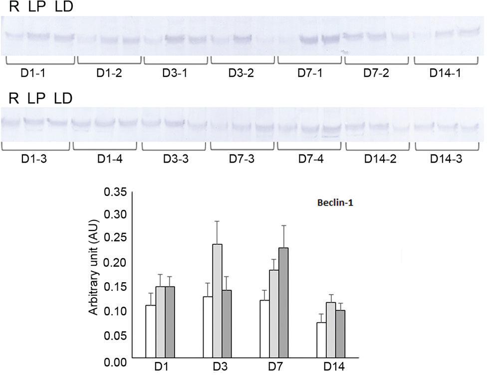 Beclin-1 protein in the right (R) (white bar), left proximal (LP) (light gray bar), and left distal (LD) (dark gray bar) sciatic nerves of rats sacrificed at day 1 (D1), day 3 (D3), day 7 (D7), and day 14 (D14) after nerve crush (n = 7 for each time point). Representative immunoblots are shown above. The bar chart demonstrates the average protein level at each time point. Error bars represent SEM.