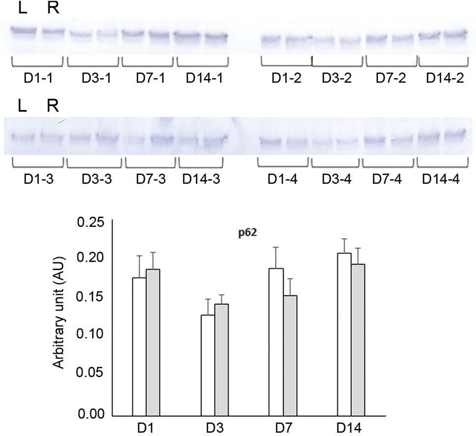 p62 protein in the right (white bars) and left (light-gray bars) L4-6 dorsal root ganglia of rats sacrificed at day 1 (D1), day 3 (D3), day 7 (D7), and day 14 (D14) after nerve crush (n = 7 for each time point). Representative immunoblots are shown above. The bar chart demonstrates the average protein level at each time point. Error bars represent SEM.
