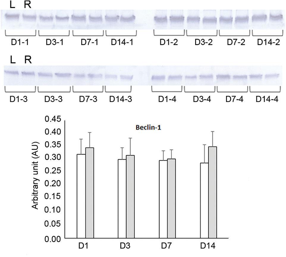 Beclin-1 protein in the right (R, white bars) and left (L, gray bars) L4-6 dorsal root ganglia of rats sacrificed at day 1 (D1), day 3 (D3), day 7 (D7), and day 14 (D14) after nerve crush (n = 7 for each time point). Representative immunoblots are shown above. The bar chart demonstrates the average protein level at each time point. Error bars represent SEM.