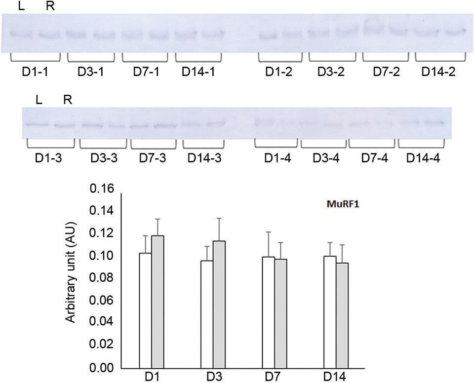 Muscle ring finger-1 protein in the right (R, white bars) and left (L, left bars) L4-6 dorsal root ganglia of rats sacrificed at day 1 (D1), day 3 (D3), day 7 (D7), and day 14 (D14) after nerve crush (n = 7 for each time point). Representative immunoblots are shown above. The bar chart demonstrates the average protein level at each time-point. Error bars represent SEM.